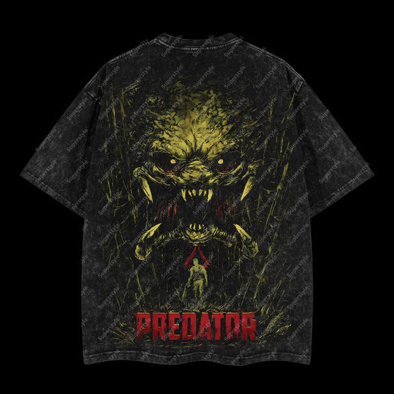 Alien Warrior Yautja "Predator" Edition Double Printed Oversize Lightweight Acid Washed T-Shirt